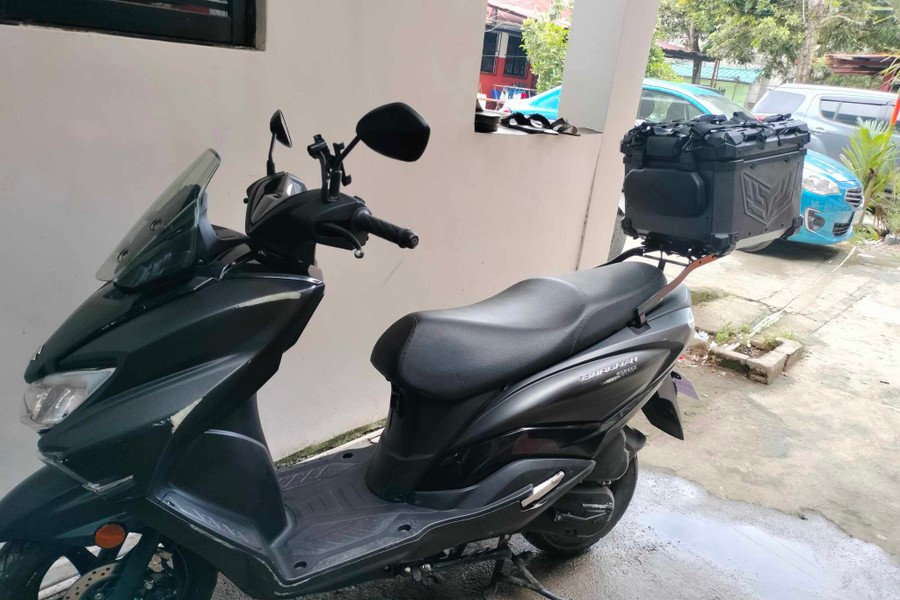 Free use of Freedconn BT, action camera holder, and one set of Motowolf Raincoat. A 2023 Suzuki Burgman 125 Street in stunning black with a sturdy crash guard for added protection. This well-maintained scooter features a bright 40-watt MDL head lamp ensuring excellent visibility on all your rides, 21 L Underseat storage, a 45 L Top Box, a Quadlock Phone Holder, and a Quadlock waterproof case. Experience a smooth, with this reliable and sleek city cruiser that's ready for your exciting long ride journey!