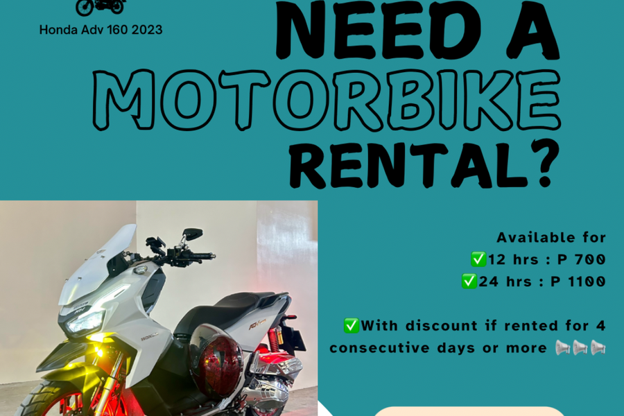 🏍 ADV ***Motor Rental TONDO, MANILA‼️‼️ —Honda ADV 160 White with 6,xxx mileage only - FREE USE of 1 full face helmet size medium (Evo GSX3000) 🪖 - FREE USE of 1 raincoat 💦 - with mini driving lights (white & yellow) 🔦 - PIAA horn 📢 - with underglow lights (red) 🚨 - with cellphone holder (Motowolf) 📱 - with USB charging port 🔋 - Guaranteed well maintained unit ✅ -Pick up @TONDO Manila -We Deliver around Manila Area or depende sa mapaguusapan just Add minimal Transpo fee ⛽️⛽️⛽️ Full tank to full tank basis ⛽️⛽️⛽️ Available for ✅12 hrs : P 700 ✅24 hrs : P 1100 ✅With discount if rented for 3 consecutive days or more 📢📢📢